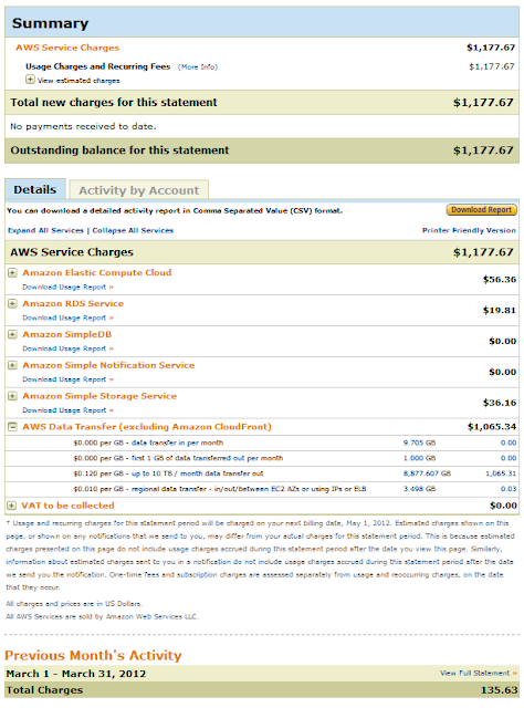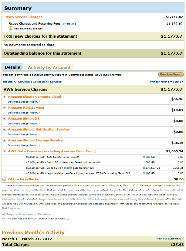 An even bigger number: \$1177.76 in usage charges! A thousand, one hundred, seventy seven dollars. Out of which \$1065 in outgoing bandwidth transfer costs. The scary part: 8.8 Terabytes of outgoing traffic! Tera. Not Giga. Terabytes.