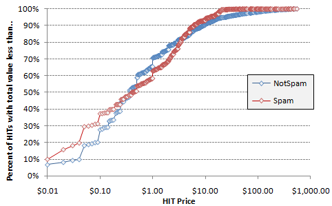 By combining the two charts above, we can plot the total value of the spam vs not spam HITs.