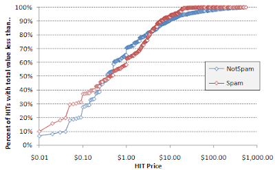 Overall, the findings are not really surprising: Most of the spam HITs require large number of workers to complete a task. They want 1000 users to click an ad, not a single user to click a thousand times at a single ad. Therefore, I suspect that most of these spam HITs have a very significant amount of redundancy, (which unfortunately we cannot observe). This means that the total value of the posted spam HITs is most probably much higher than the total value of the legitimate HITs.